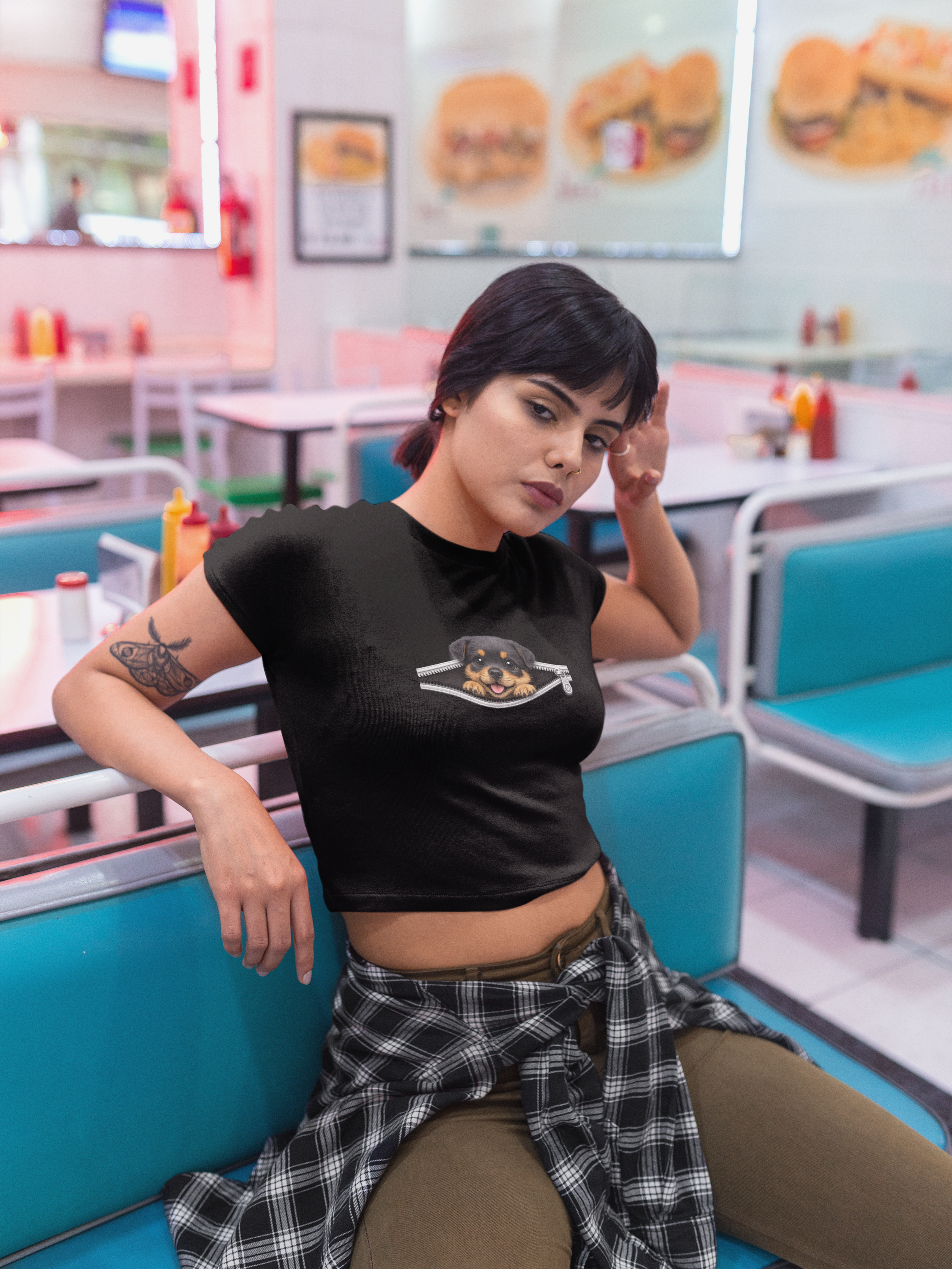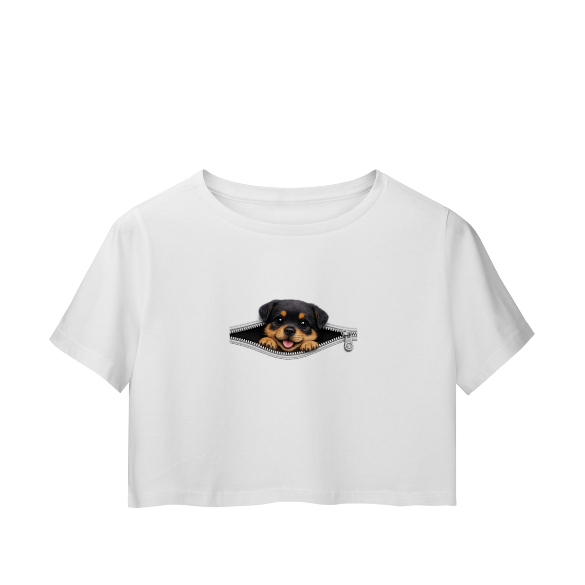 O Cropped ZIP PETS – Cute Puppy Rotweiler faz parte da coleção ZIP PETS, uma linha criativa que traz pets curiosos surgindo através de um zíper, criando um visual divertido, moderno e cheio de personalidade.