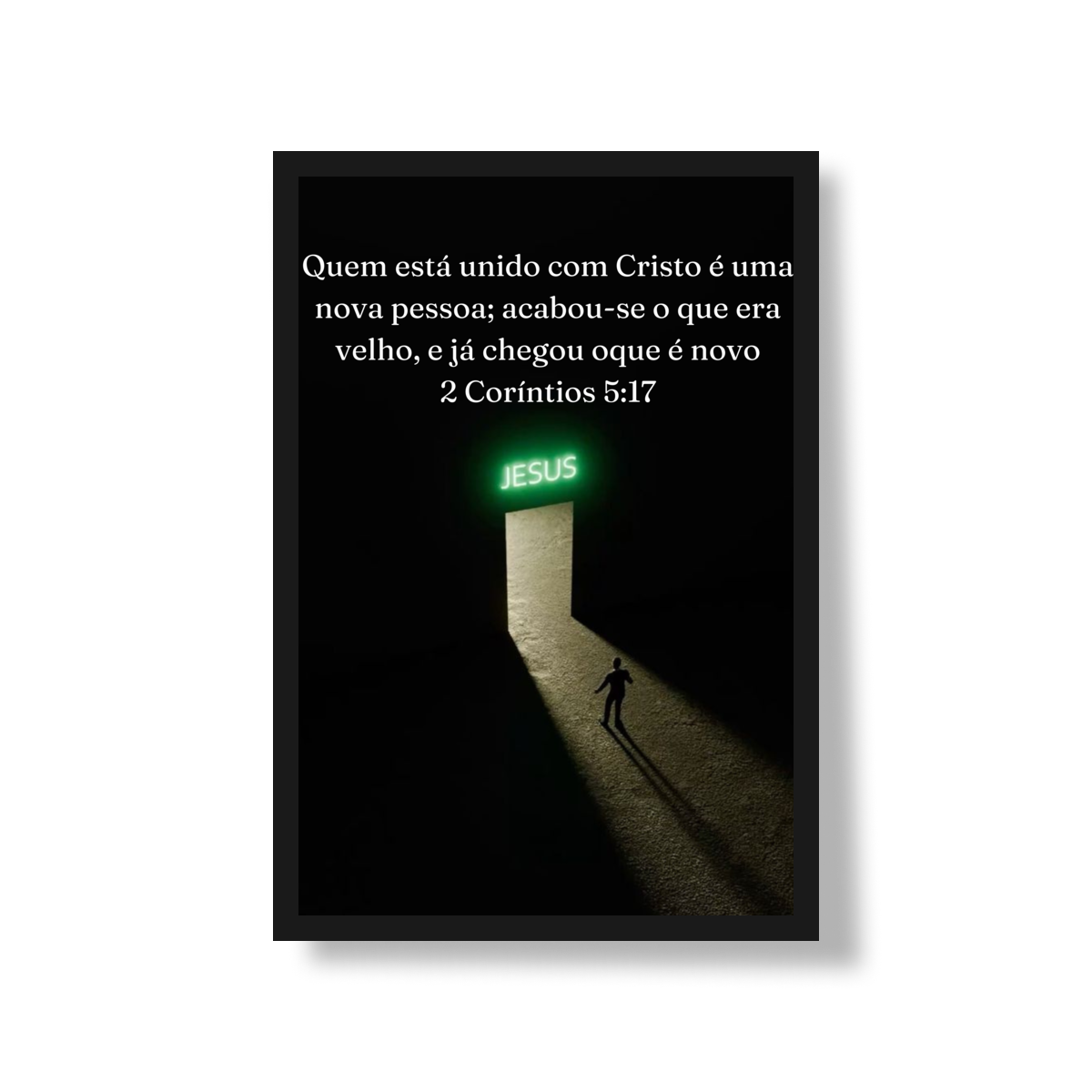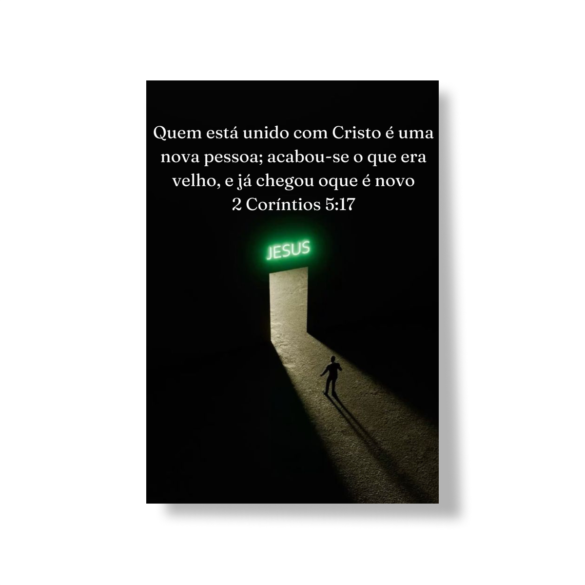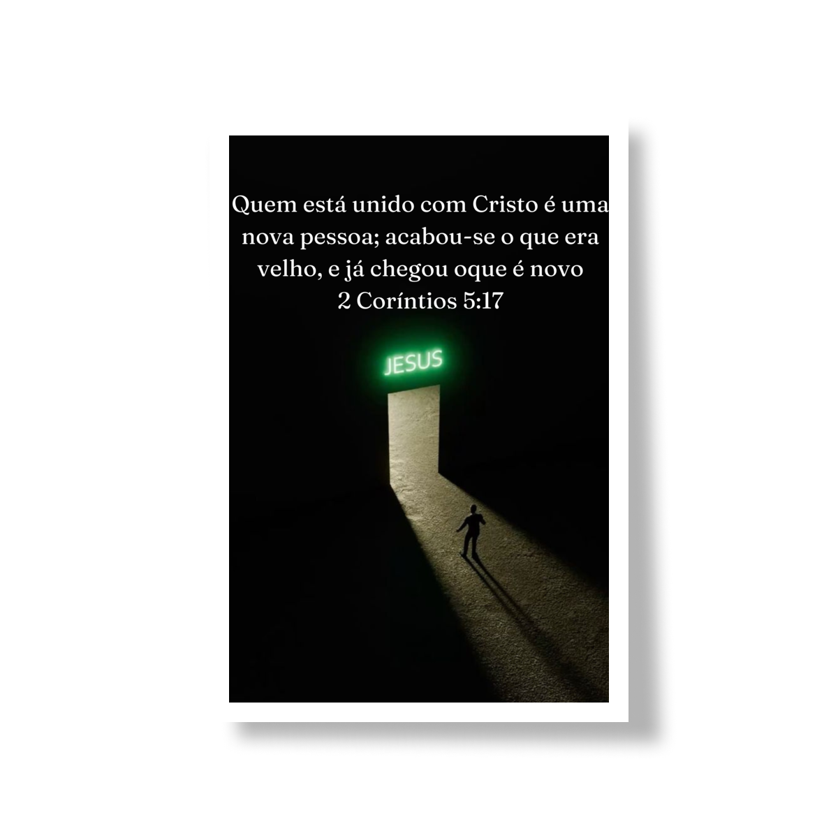 Inspirado na imagem, este pôster transmite de forma visual e profunda a mensagem de 2 Coríntios 5:17: a passagem da antiga vida para uma nova identidade em Cristo. A composição minimalista, com o fundo escuro contrastando com a luz que emana da porta iluminada com o nome JESUS, simboliza o chamado divino e o caminho da transformação espiritual. A figura humana caminhando em direção à luz representa a decisão consciente de deixar o passado para trás e avançar rumo ao novo que Deus oferece.