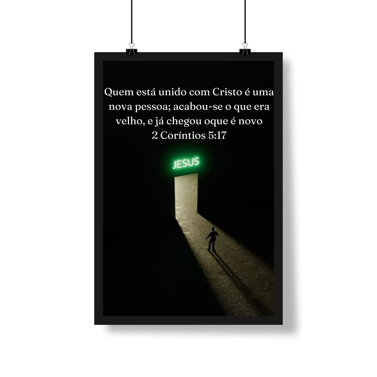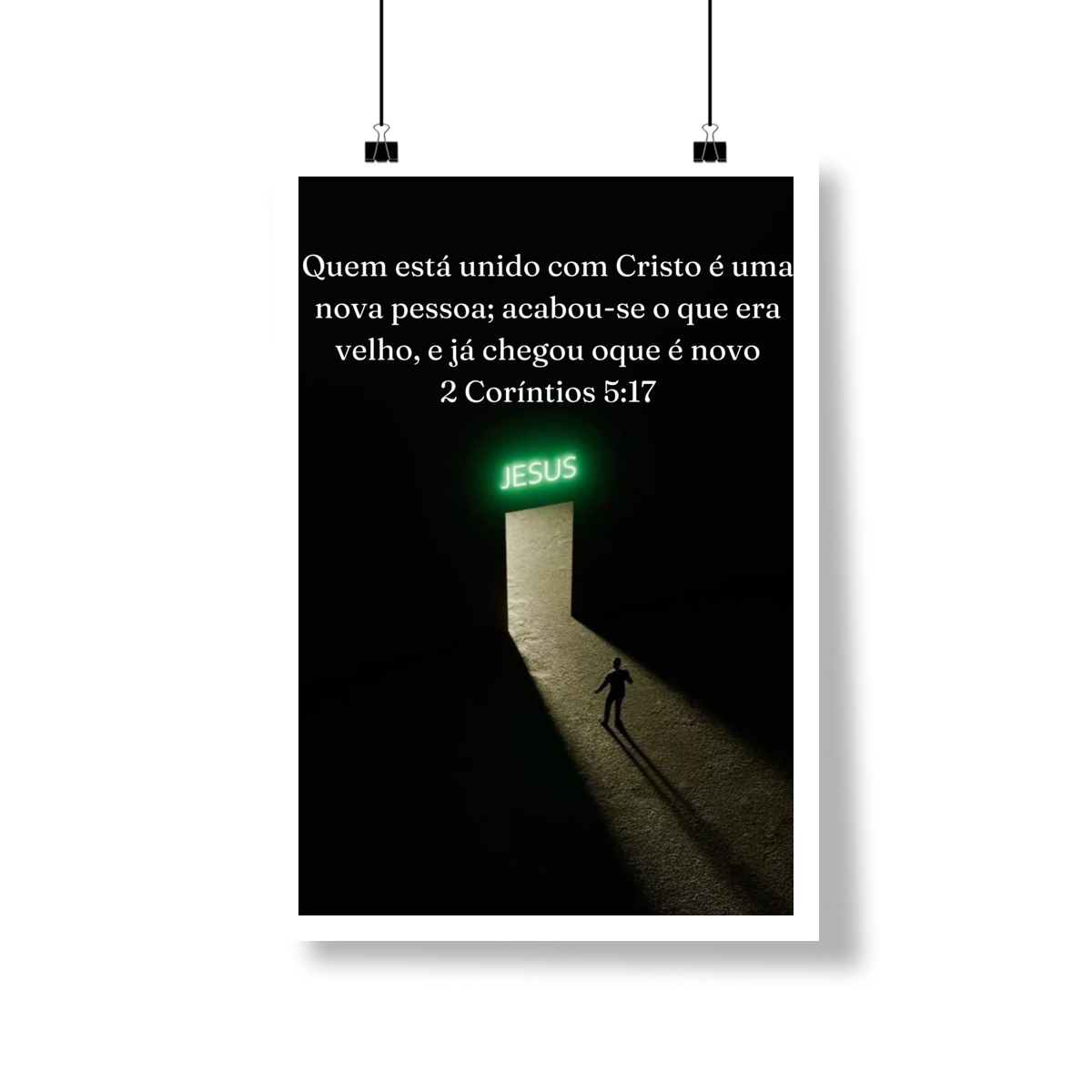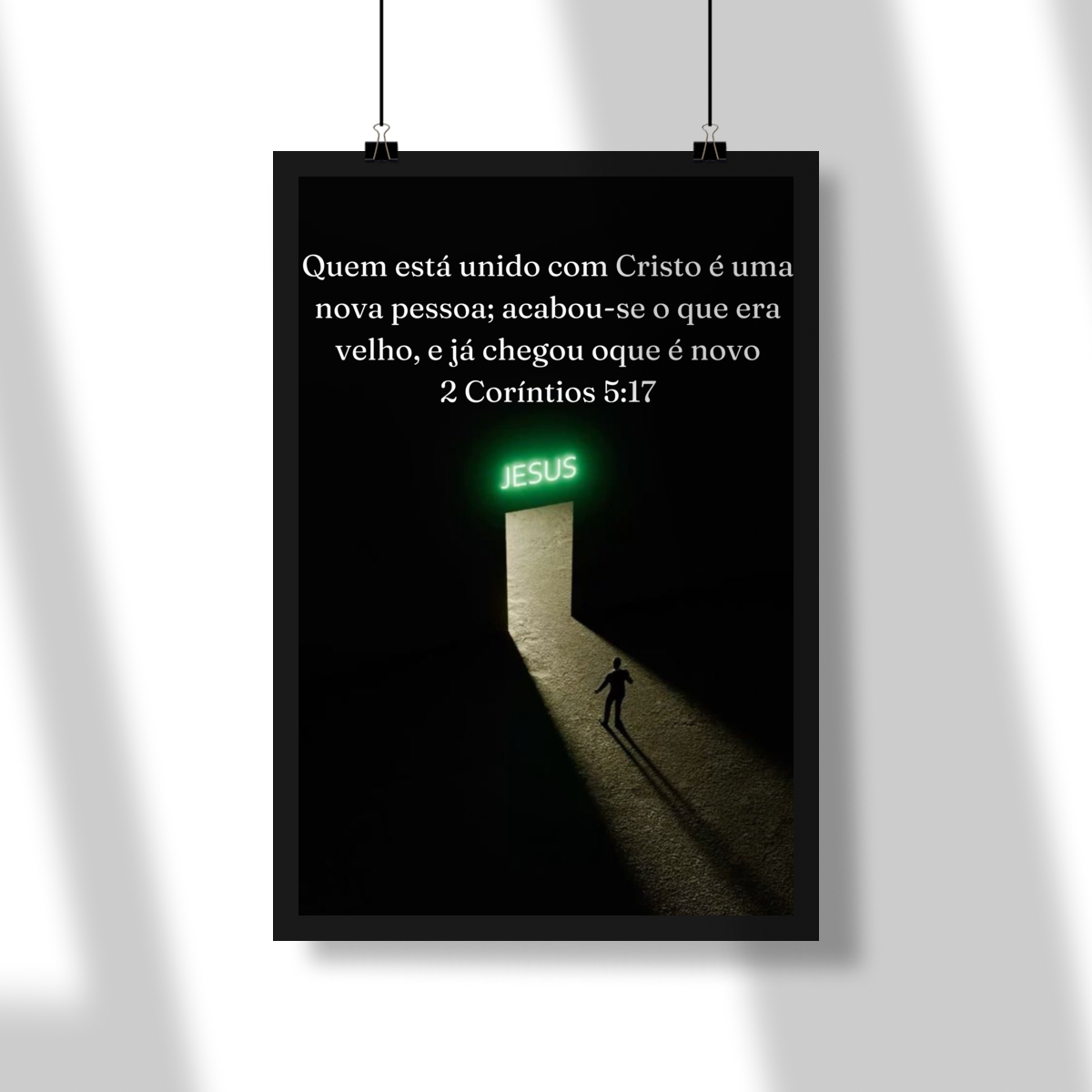 Inspirado na imagem, este pôster transmite de forma visual e profunda a mensagem de 2 Coríntios 5:17: a passagem da antiga vida para uma nova identidade em Cristo. A composição minimalista, com o fundo escuro contrastando com a luz que emana da porta iluminada com o nome JESUS, simboliza o chamado divino e o caminho da transformação espiritual. A figura humana caminhando em direção à luz representa a decisão consciente de deixar o passado para trás e avançar rumo ao novo que Deus oferece.