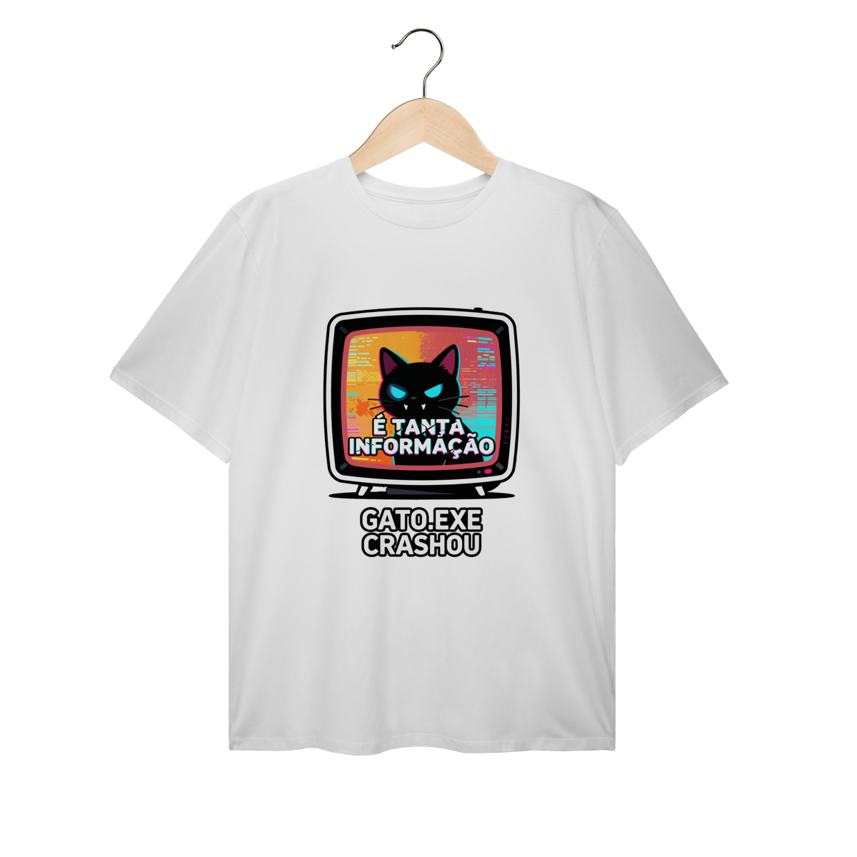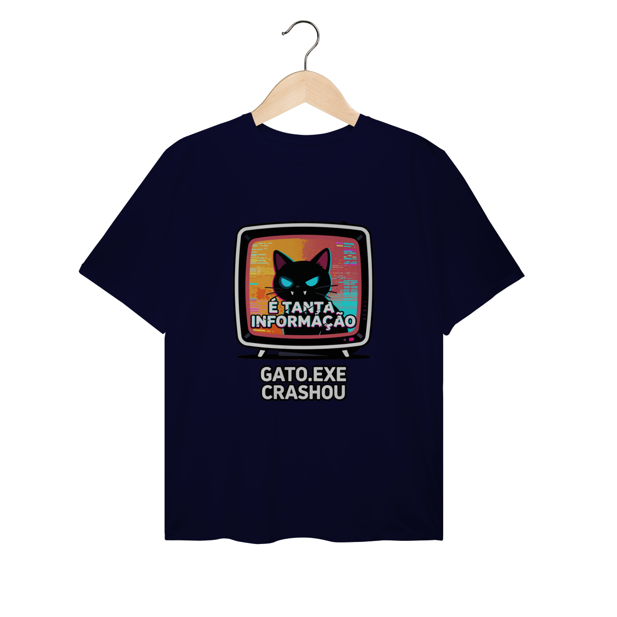 E tanta informação que o gato.exe simplesmente crashou. Camiseta exclusiva Dicavalli com nosso demônio digital possuído pelo inferno das redes sociais. Expressão de quem está preso entre a TV dos Anos 90 e o caos digital moderno. Olhos brilhando com estática vintage misturada à luz azul da tela. Design horror-comédia que captura a sobrecarga informacional da geração que cresceu analógica e enlouqueceu digital. Arte original para nerds, geeks e vítimas do excesso de informação. Qualidade premium para quem vive crashando entre nostalgia e modernidade. Sistema operacional em colapso permanente.