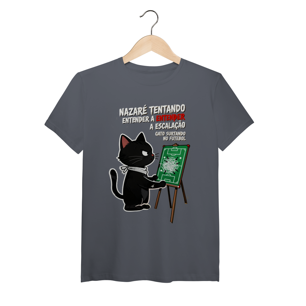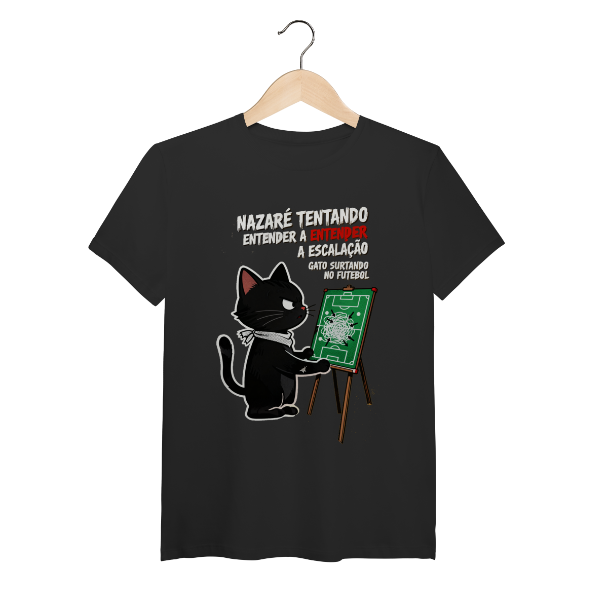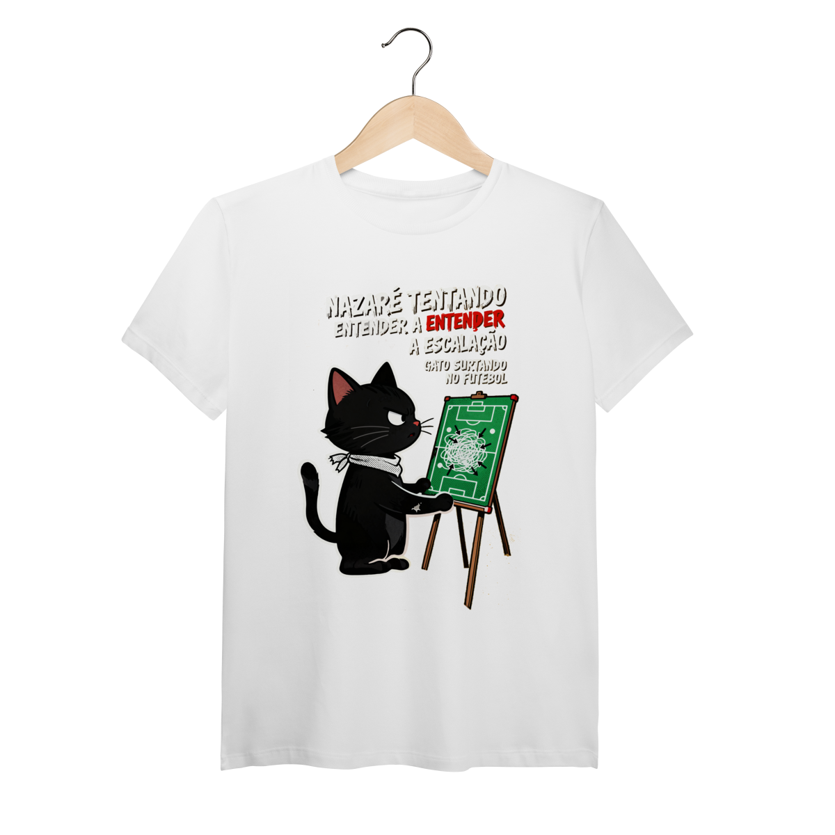 Nazaré tentando entender a escalação e surtando completamente. Camiseta exclusiva Dicavalli com nosso gato em colapso mental total diante do quadro tático. Expressão confusa e raivosa simultânea, olho tremendo, tentando decifrar setas que não levam a lugar nenhum. Design horror-comédia que captura o momento exato quando o técnico escala errado e você perde a sanidade. Arte original para torcedores que entendem que futebol é tática mas também é loucura. Ideal para nerds, geeks e analistas futebolísticos amadores enlouquecidos. Qualidade premium para quem surta com escalação todo jogo.