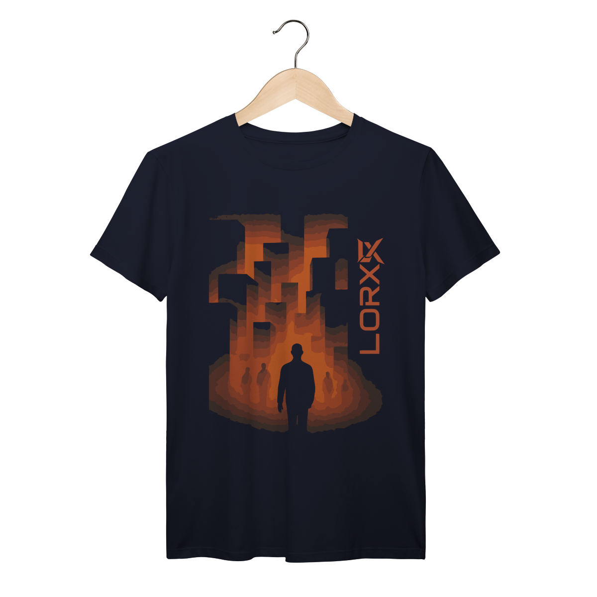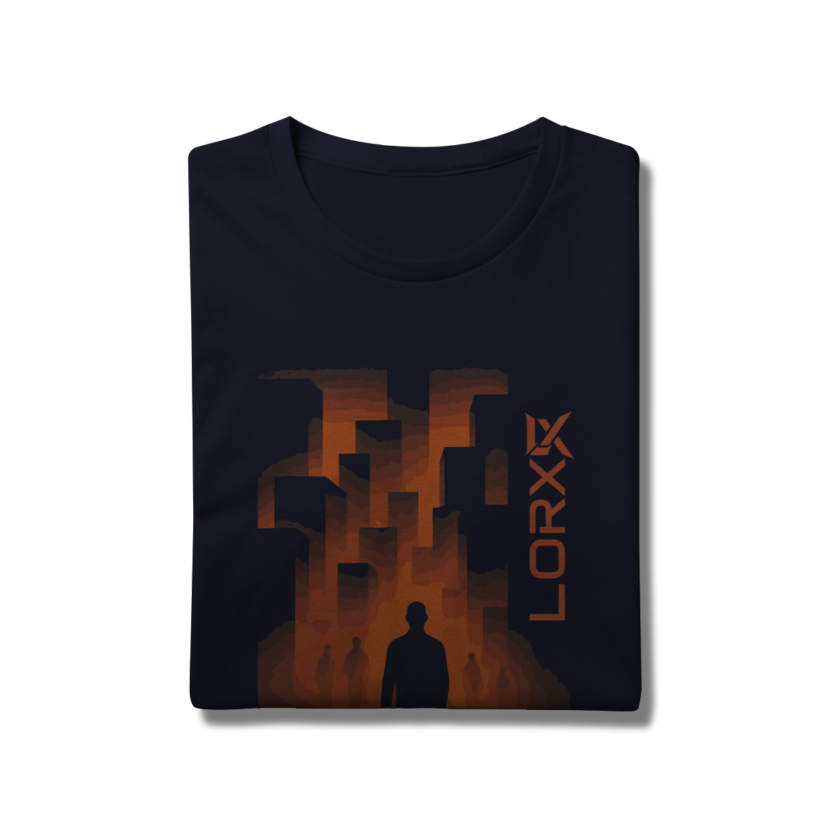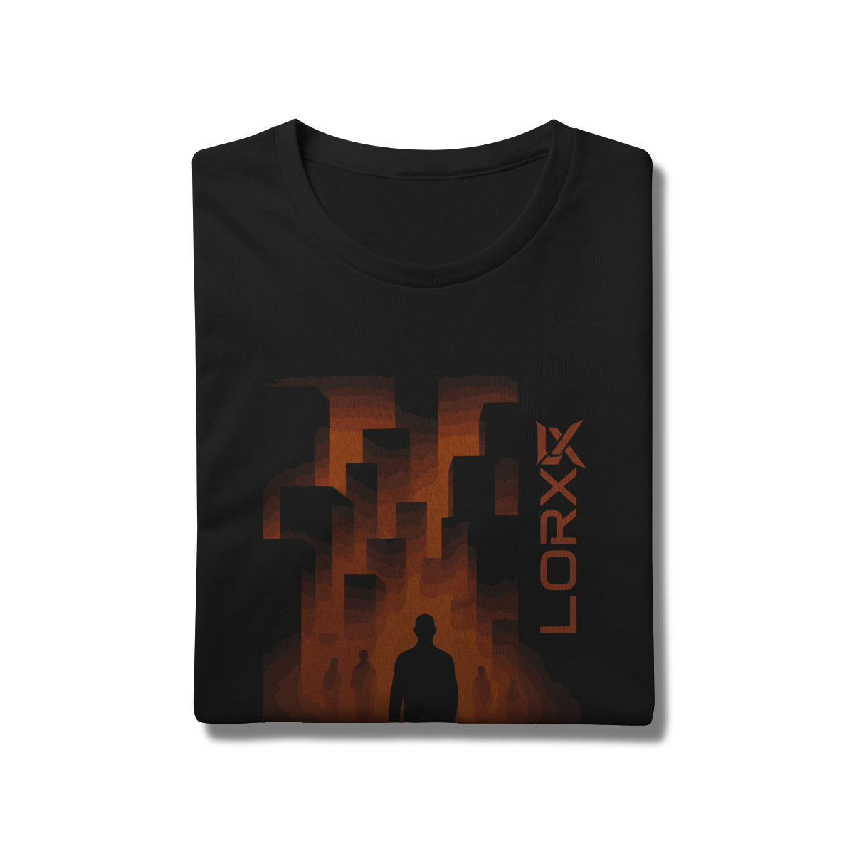 A estampa "LORX: Silhueta em Ruínas" é uma obra visual poderosa que mistura abstração, arquitetura e introspecção. No centro da composição, uma figura humana em silhueta se destaca contra um fundo vibrante de formas granuladas e gradientes flamejantes — tons de laranja, marrom e preto que evocam calor, intensidade e transformação. Ao fundo, estruturas geométricas lembram prédios em colapso ou plataformas urbanas, criando uma atmosfera distópica e provocativa.