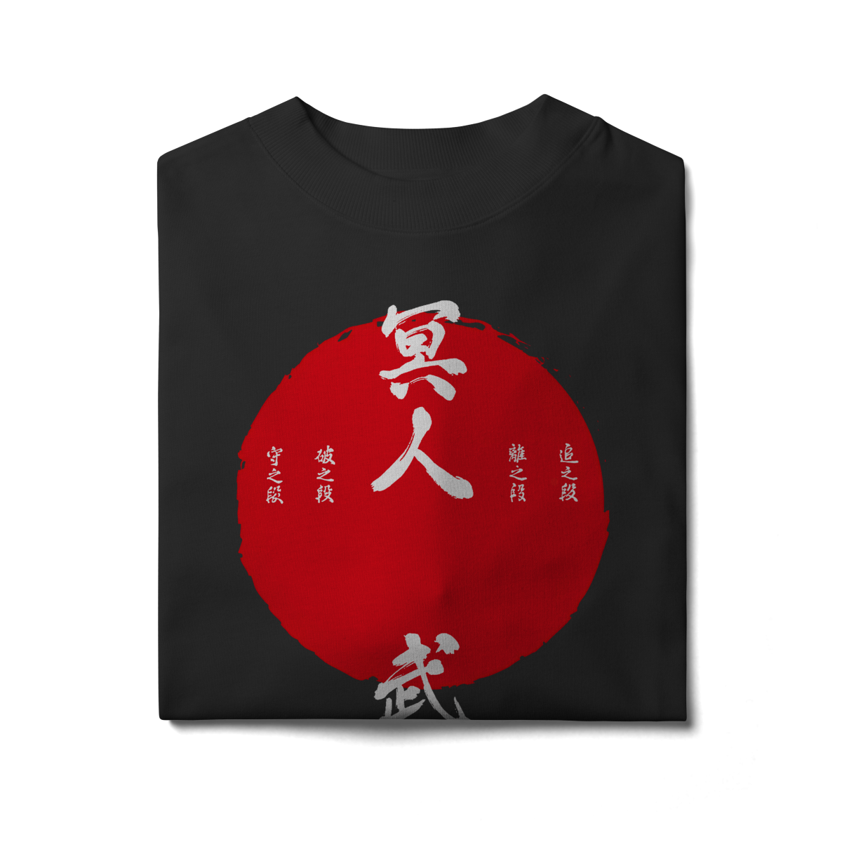 A estampa apresenta o sol vermelho do Japão e os kanjis que representam as quatro posturas lendárias e a dualidade entre Bushido e Yūrei — o guerreiro e o espectro.