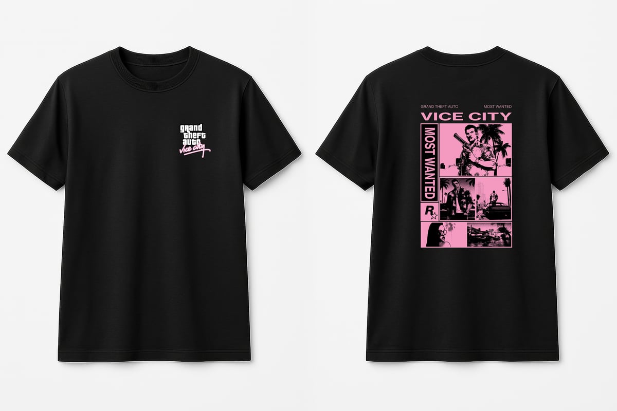 Inspirada na estética neon e no clima caótico das ruas de Vice City, essa peça é puro estilo retrô com atitude de quem não passa despercebido.
