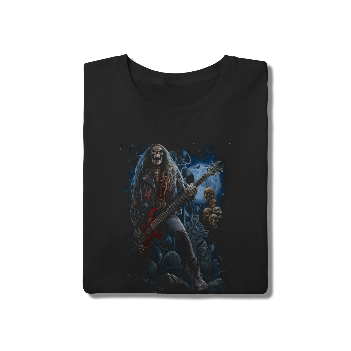 • A essência do Rock em uma estampa. Um esqueleto metaleiro detonando na guitarra em um cenário clássico de cemitério sob a lua cheia. Detalhes góticos e sombrios que todo fã de Heavy Metal respeita. Modelagem tradicional unissex, confortável e resistente, pronta para qualquer show ou festival.