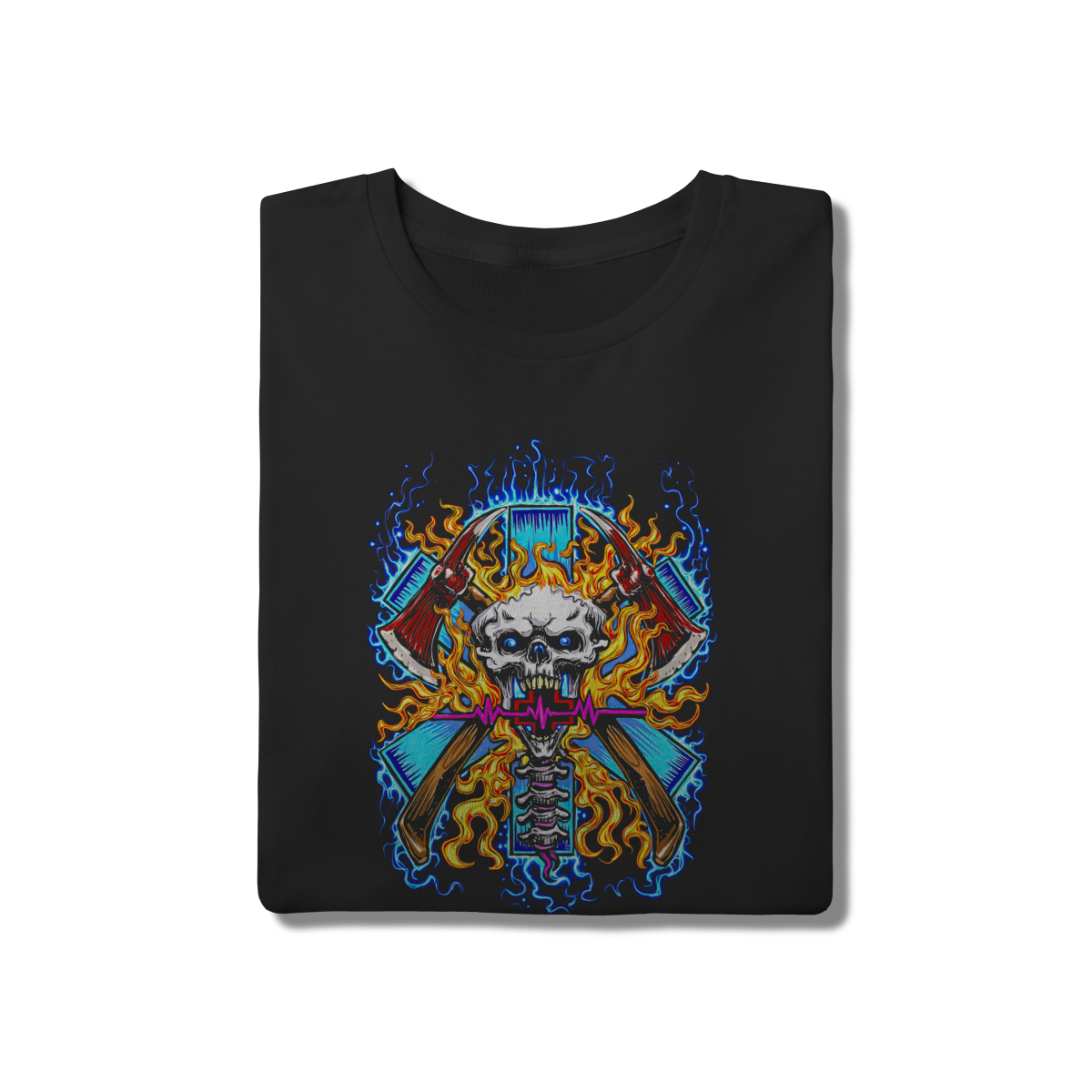 • Homenagem e estilo em uma única peça. Com uma caveira envolta em chamas azuis e amarelas, machados de resgate e o símbolo da estrela da vida, esta camiseta é ideal para heróis do cotidiano e admiradores da profissão. Estampa de alta definição em algodão respirável de alta qualidade.