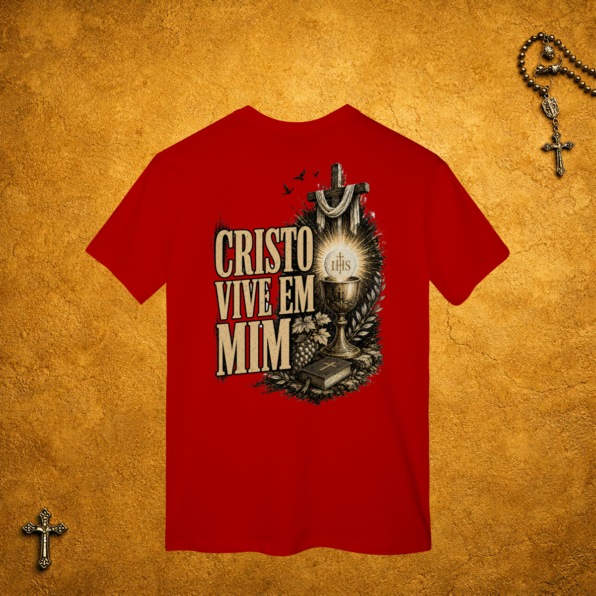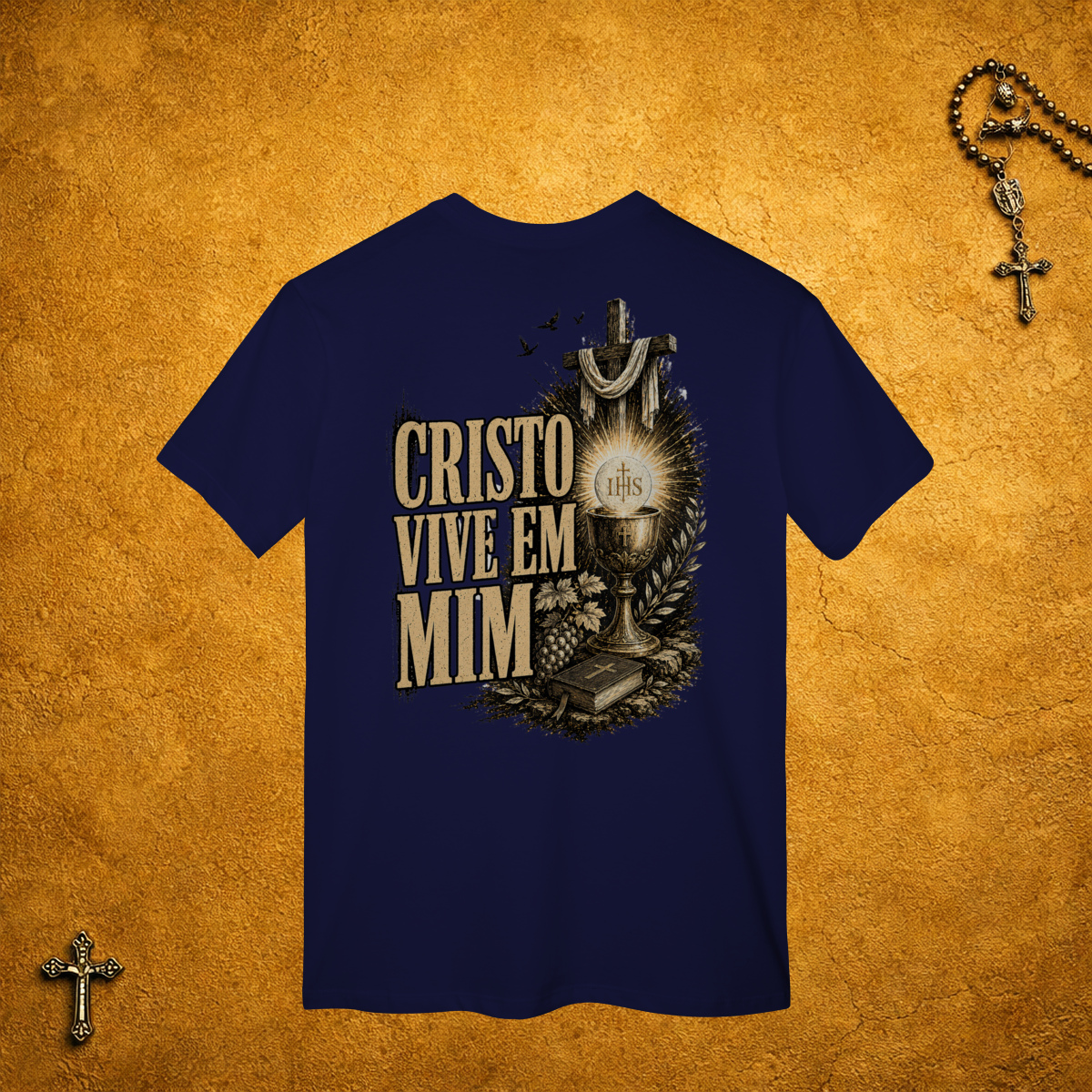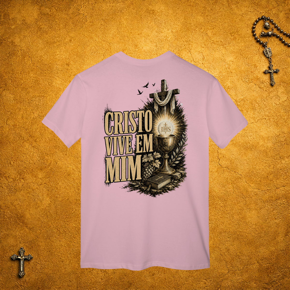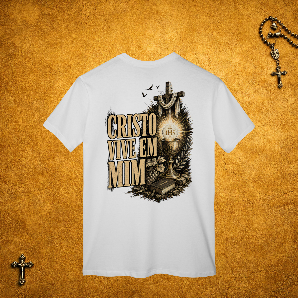 A parte da frente da camiseta é básica, sem estampa. Mas nas costas, a estampa e o texto são grandes, do tamanho da sua fé!