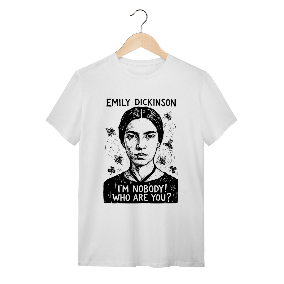 Camiseta Branca: Retrato de Emily Dickinson em linocut, cercada por abelhas, elementos da natureza e a tipografia "I'M NOBODY! WHO ARE YOU?".