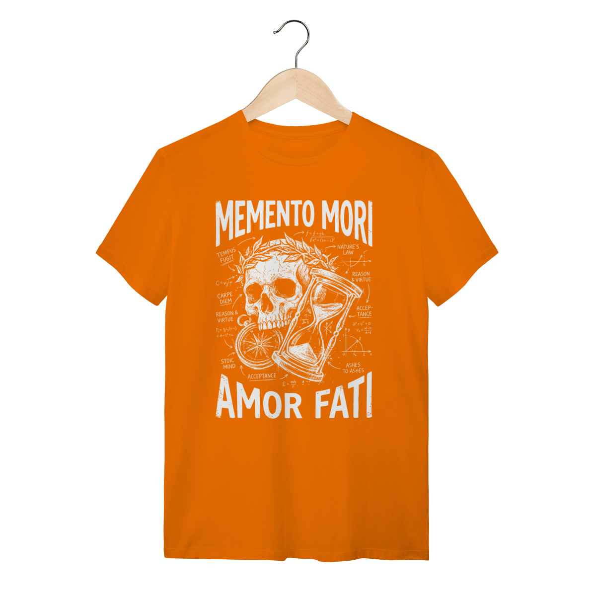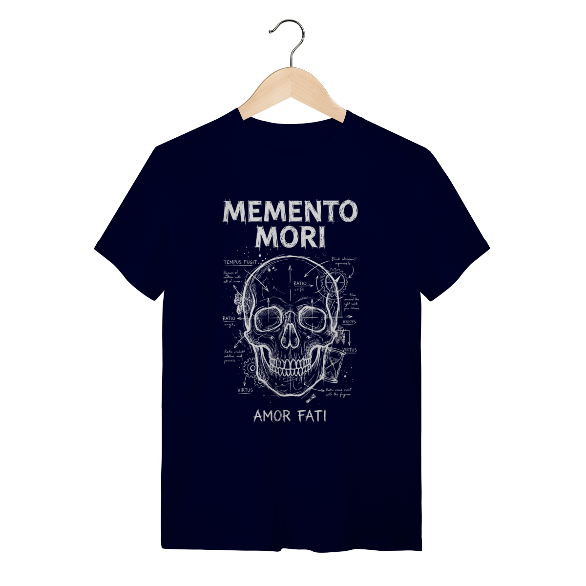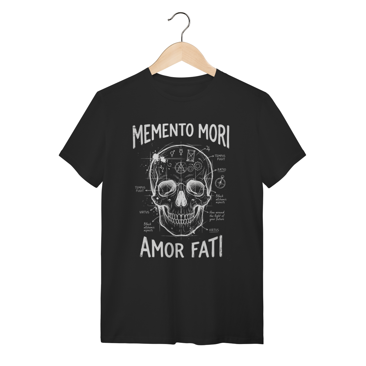 A estampa traz uma composição visual impactante com a estética de "esboço renascentista" ou diagrama técnico (blueprint). A ilustração central da caveira (símbolo da finitude humana) conecta-se com a ampulheta (o tempo inexorável) através de anotações, setas e linhas geométricas que lembram os estudos de Da Vinci. O traço texturizado estilo "giz" ou bico de pena confere um ar intelectual, transformando um conceito filosófico profundo em uma obra de arte vestível e sofisticada.