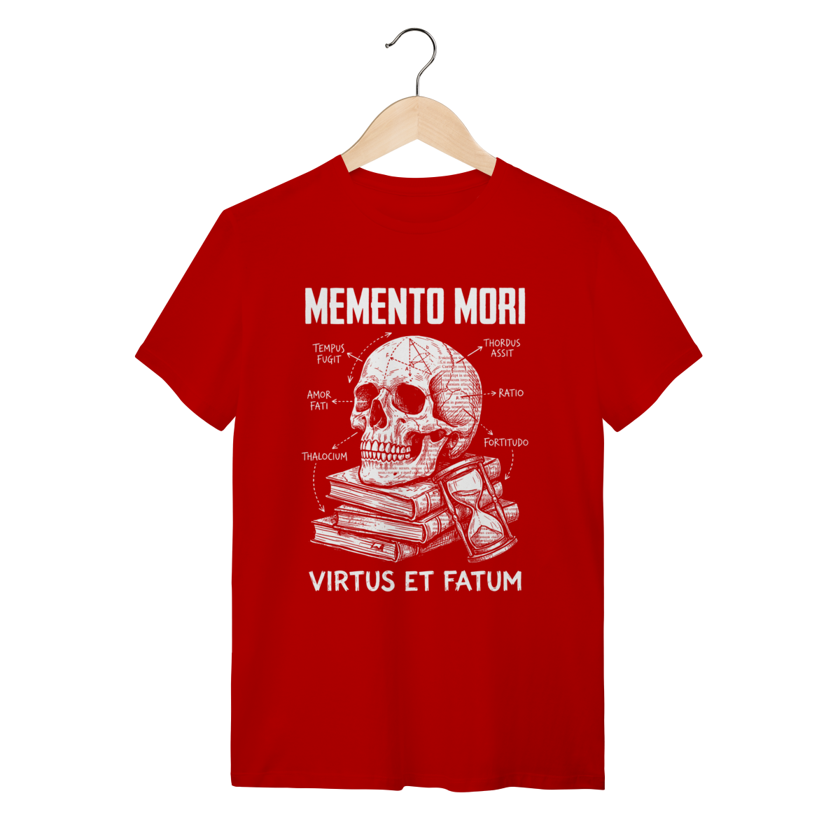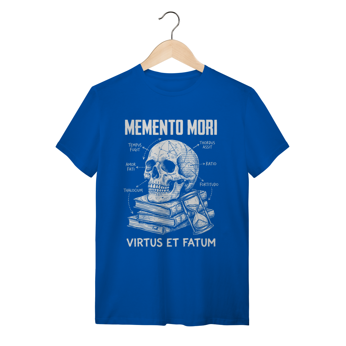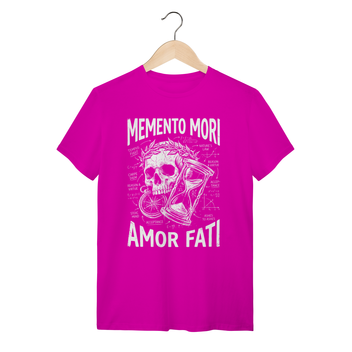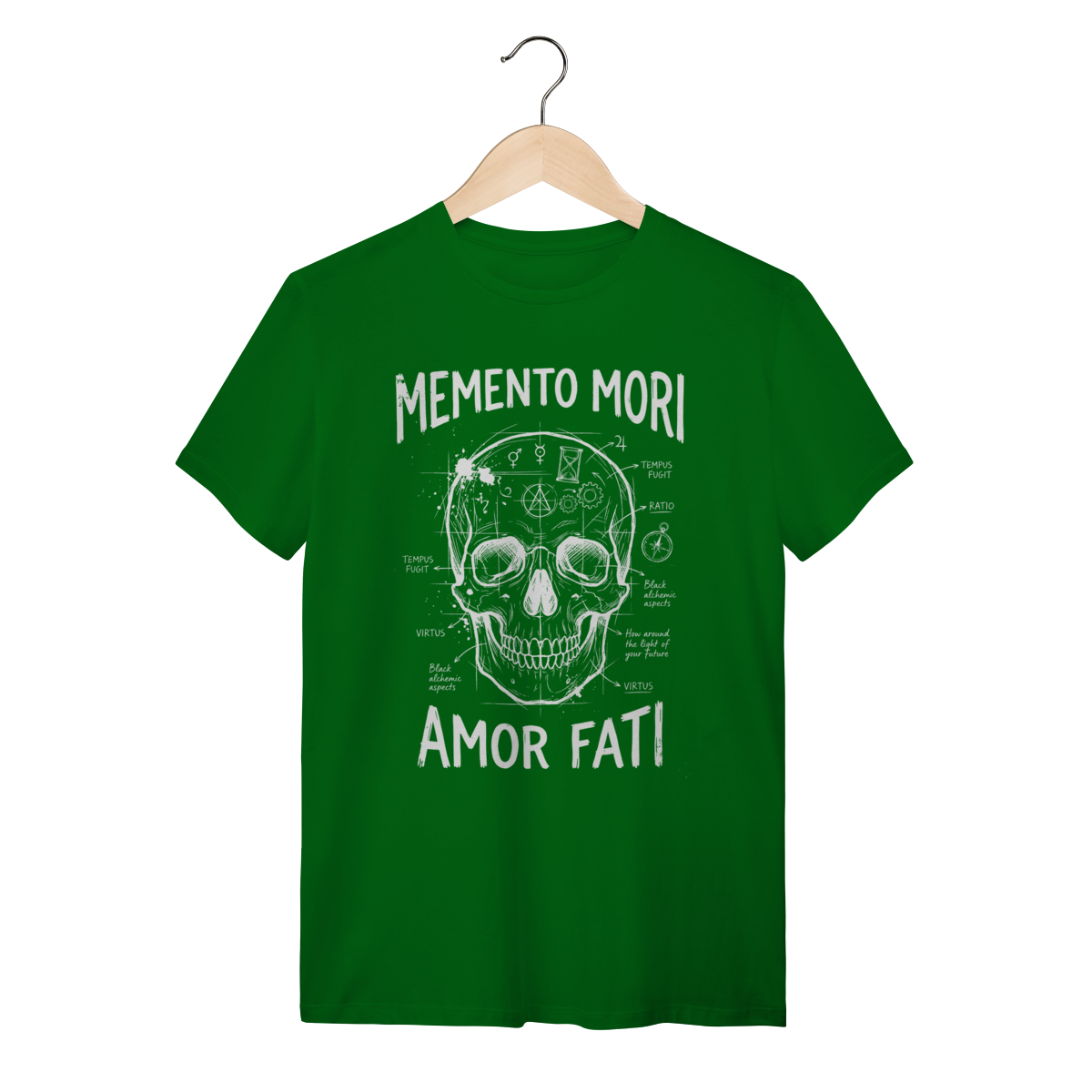 A estampa traz uma composição visual impactante com a estética de "esboço renascentista" ou diagrama técnico (blueprint). A ilustração central da caveira (símbolo da finitude humana) conecta-se com a ampulheta (o tempo inexorável) através de anotações, setas e linhas geométricas que lembram os estudos de Da Vinci. O traço texturizado estilo "giz" ou bico de pena confere um ar intelectual, transformando um conceito filosófico profundo em uma obra de arte vestível e sofisticada.