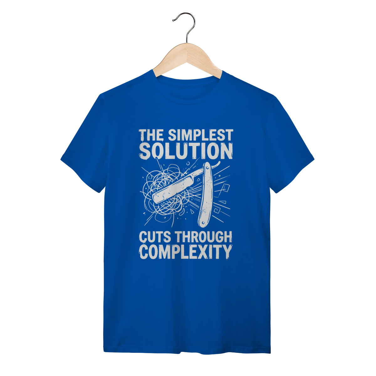 A estampa traz uma representação visual impactante e "vintage": uma navalha clássica cortando literalmente um emaranhado caótico de linhas (a confusão/complexidade) para revelar uma lâmpada acesa ou uma seta direta (a solução clara). O traço estilo "sketch" acadêmico confere um ar de anotação de laboratório ou diário de um gênio, tornando a peça intelectualmente estimulante e esteticamente sofisticada.