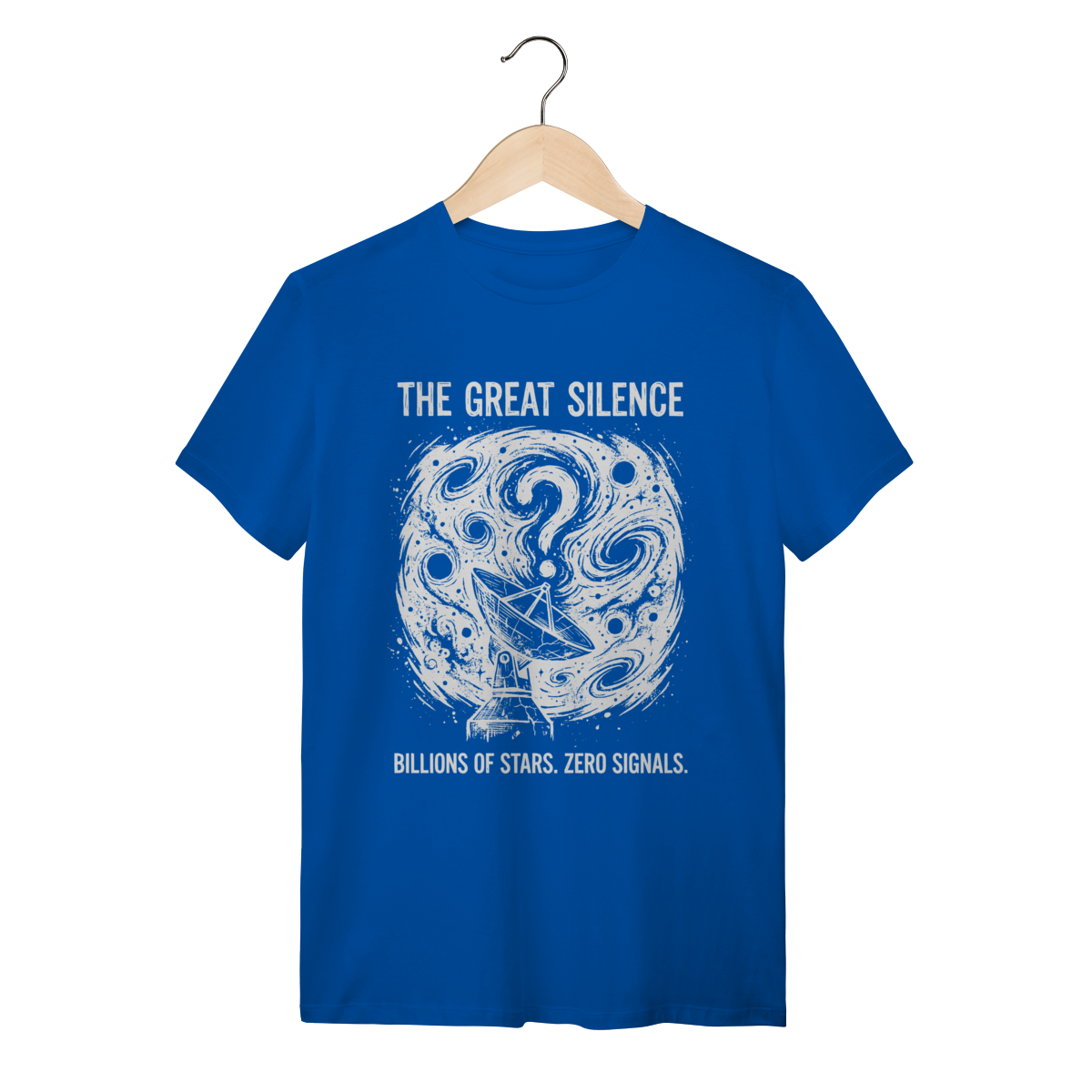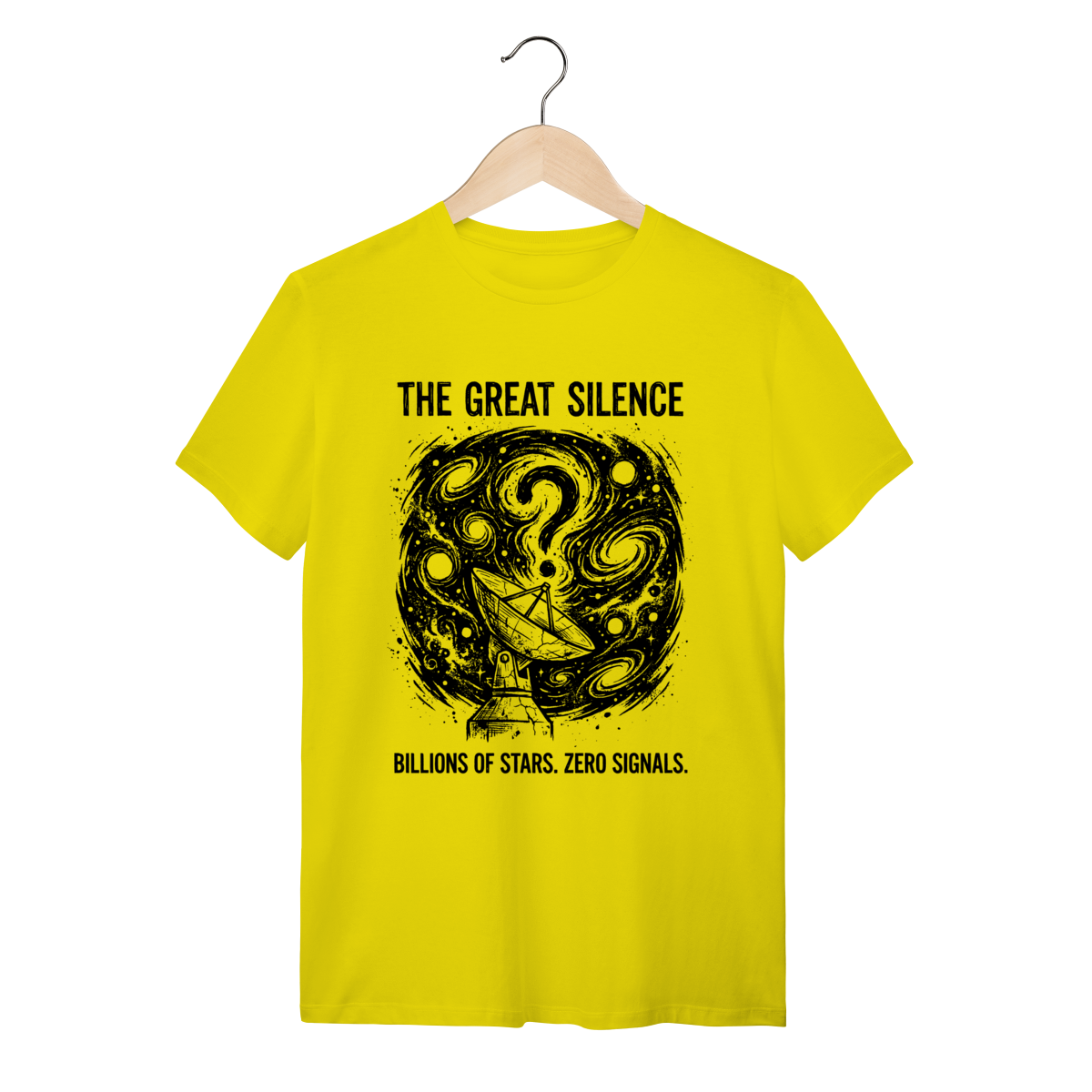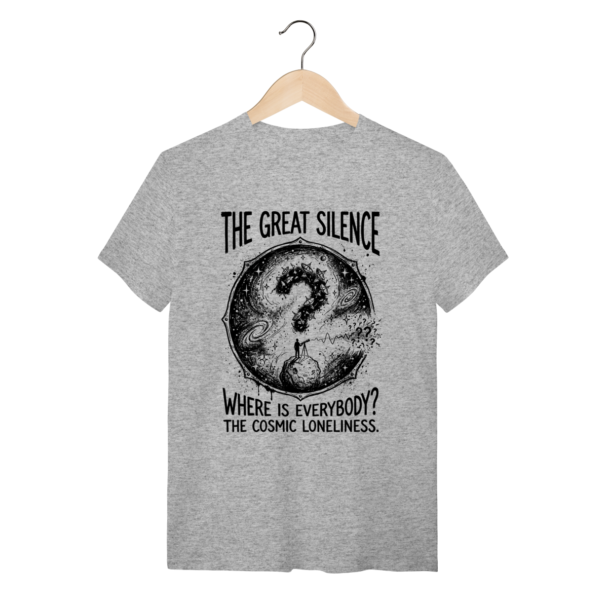 A estampa traduz essa angústia sublime com maestria. Vemos a imensidão do cosmos espiralando em um grande ponto de interrogação, enquanto um observador solitário (ou uma antena parabólica) busca desesperadamente um sinal. O traço artístico, com texturas de "ruído" e desgaste, evoca a estática do espaço profundo e a antiguidade do universo. O contraste entre o fundo escuro e os elementos claros destaca a fragilidade da nossa busca por contato. É visualmente impactante, intelectualmente provocativo e inegavelmente estiloso.