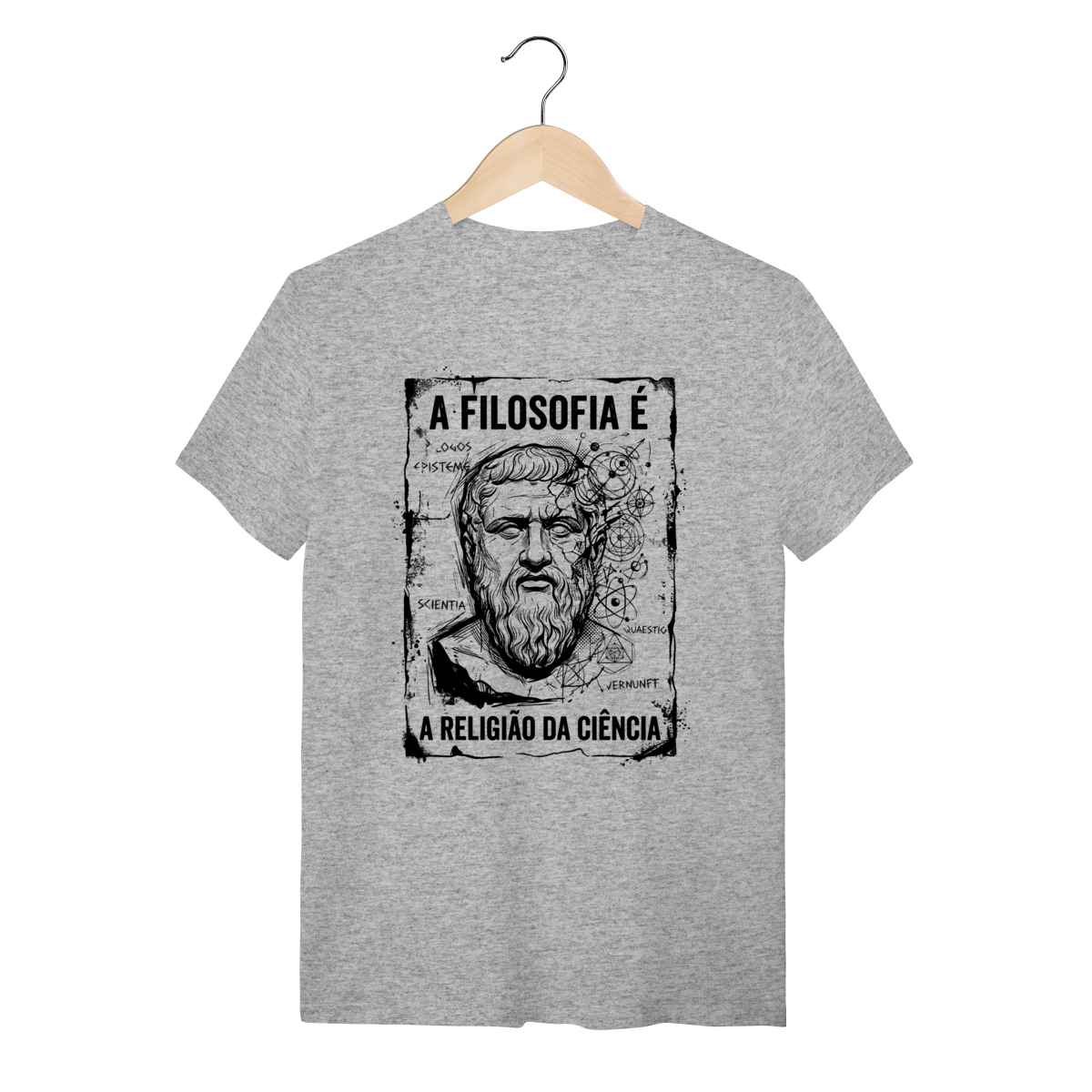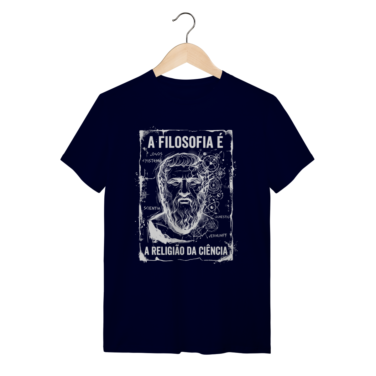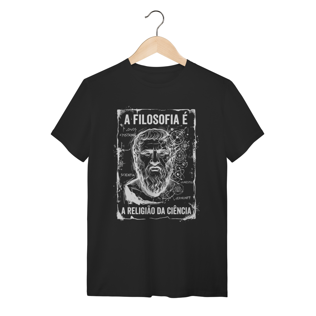A arte traz um design impactante em estilo sketch (esboço manual) e grunge, apresentando o busto de um filósofo clássico mesclado a elementos de geometria sagrada, órbitas atômicas e anotações intelectuais como "Logos", "Episteme" e "Scientia". O contraste do traço branco sobre o fundo escuro cria uma estética de "anotação de gênio", passando uma imagem de profundidade e complexidade. É uma obra de arte que veste.