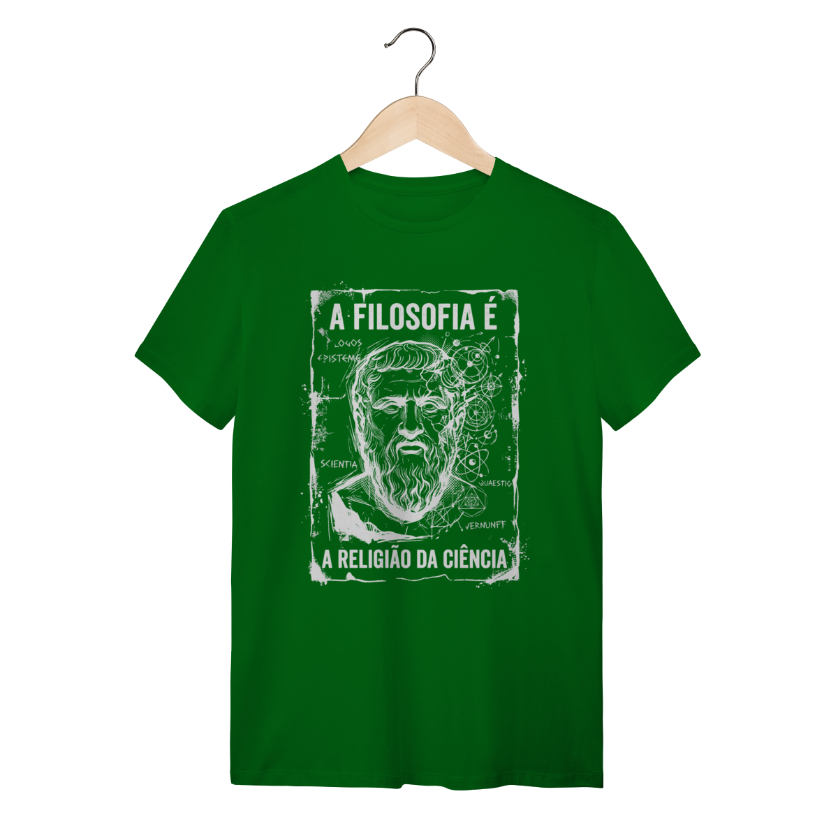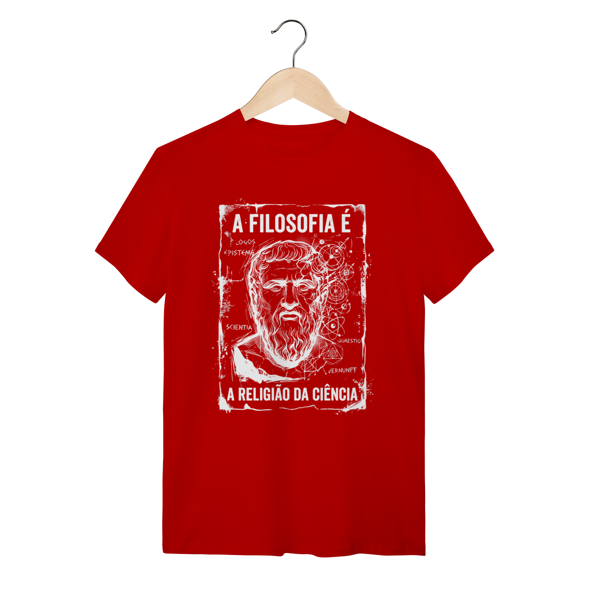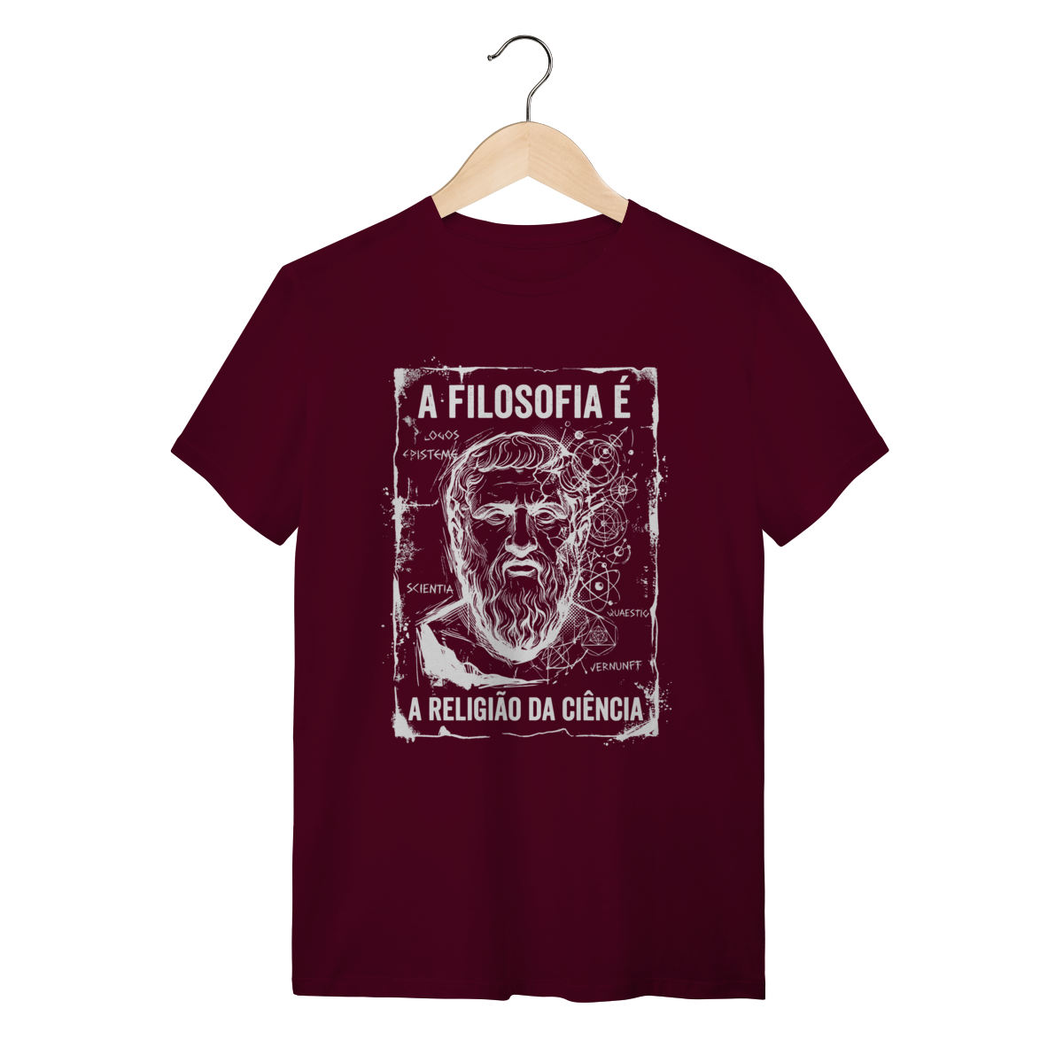 A arte traz um design impactante em estilo sketch (esboço manual) e grunge, apresentando o busto de um filósofo clássico mesclado a elementos de geometria sagrada, órbitas atômicas e anotações intelectuais como "Logos", "Episteme" e "Scientia". O contraste do traço branco sobre o fundo escuro cria uma estética de "anotação de gênio", passando uma imagem de profundidade e complexidade. É uma obra de arte que veste.
