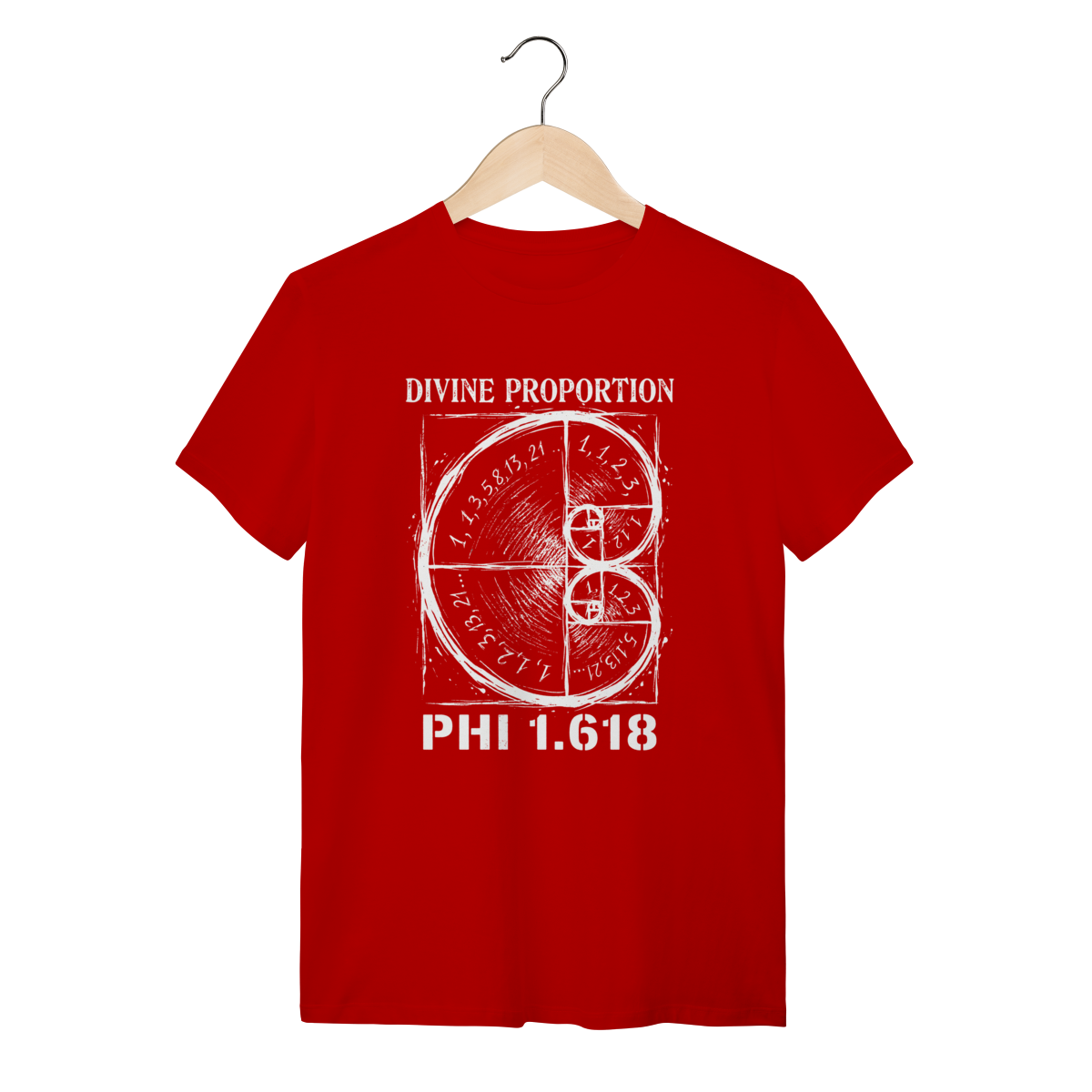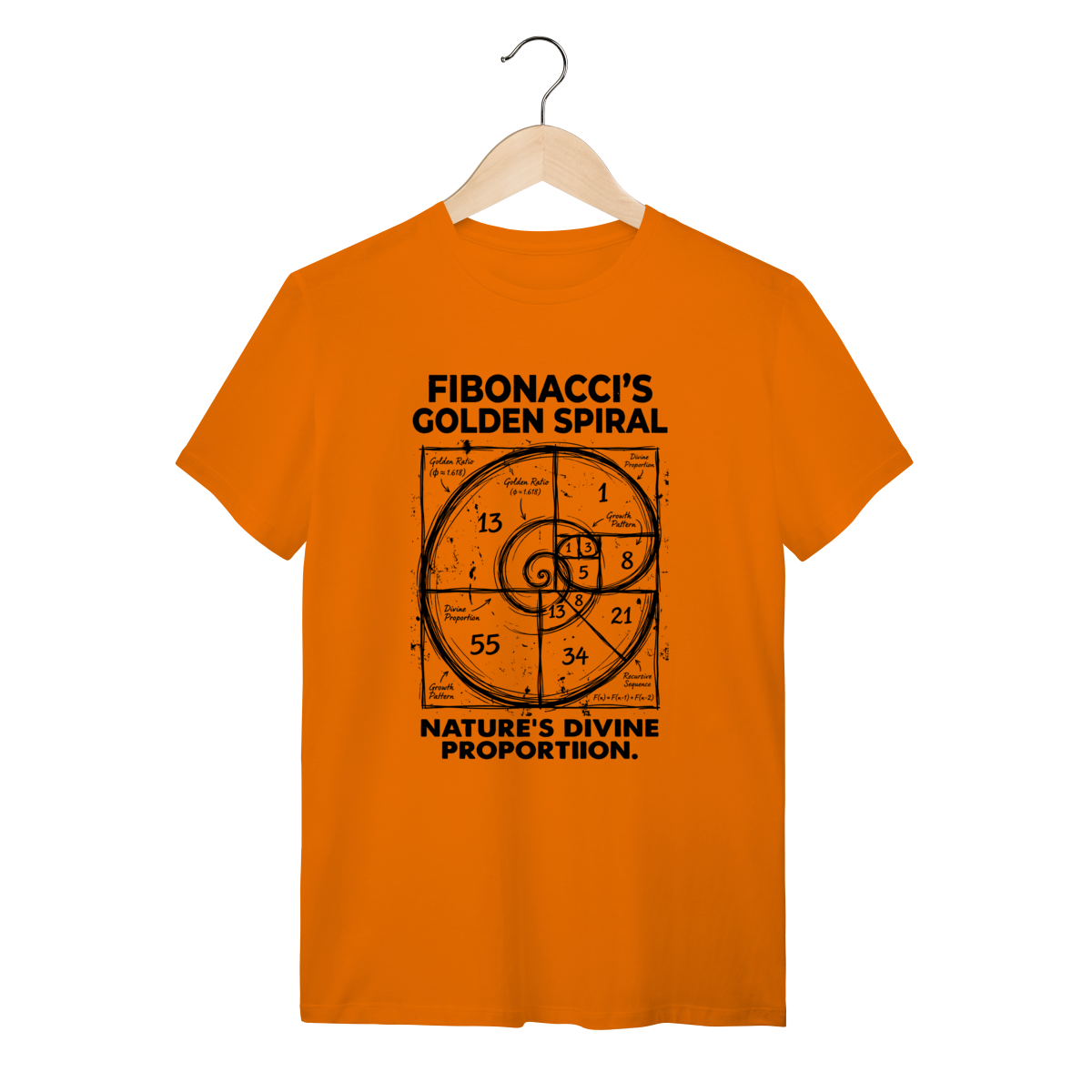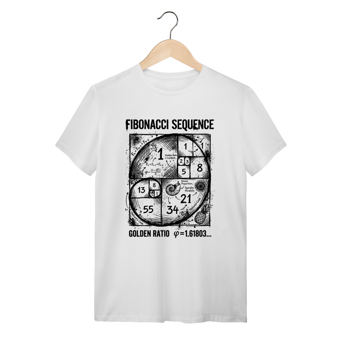 A estampa captura a essência da "Divina Proporção" com uma estética de rascunho técnico e engenharia clássica. O design apresenta a famosa espiral logarítmica sobreposta à grade geométrica, acompanhada pelos números da sequência (1, 1, 2, 3, 5, 8...) e notações matemáticas que remetem aos cadernos de Leonardo da Vinci. O traço texturizado estilo "grunge" confere um visual intelectual e atemporal, transformando uma fórmula matemática em pura elegância visual.