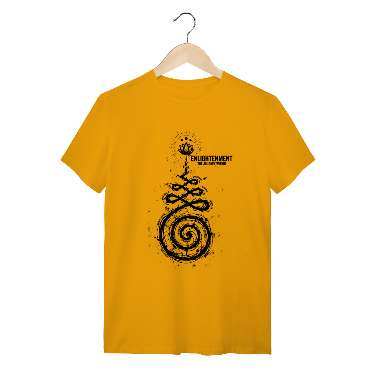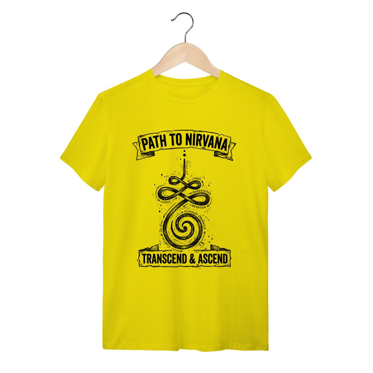 A estampa captura a essência budista com uma estética artística e detalhada. Algumas variações apresentam o símbolo puro em traços de pincel "Zen", enquanto outras trazem um "diagrama da alma" com anotações sobre Karma, Samsara e Moksha, remetendo a um estudo profundo do ser. O visual texturizado (grunge) confere autenticidade e um ar de sabedoria ancestral, transformando um conceito espiritual em uma peça de vestuário sofisticada e cheia de significado.