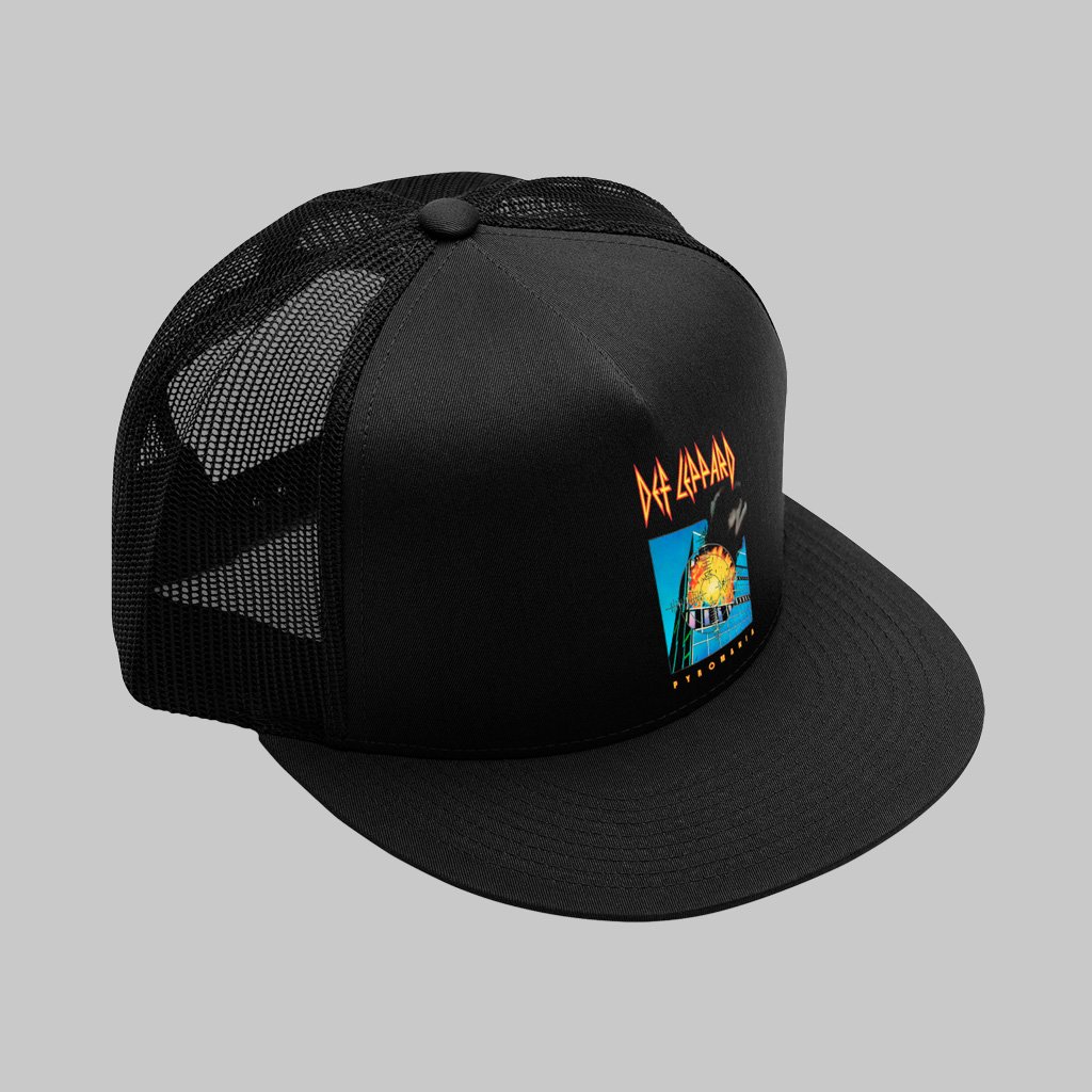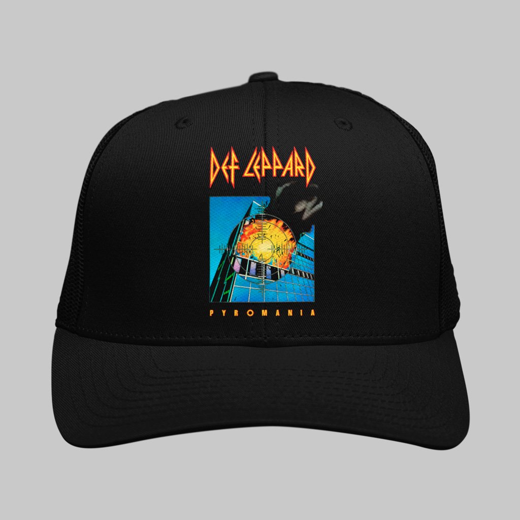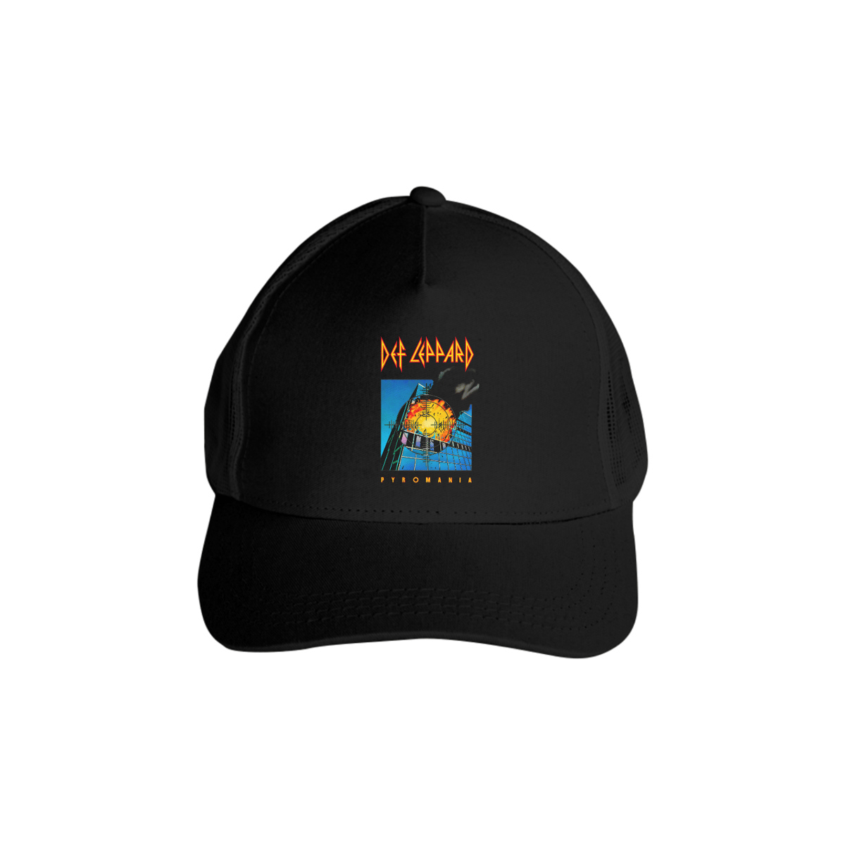 O logo pontudo e a mira sobre a explosão de Pyromania transformaram 1983 em uniforme de estádio. Este boné traz a mesma energia de palco: frente em tecido para receber a arte, laterais em tela que lembram os truckers dos 80s e ajuste traseiro para segurar firme no solo de guitarra.