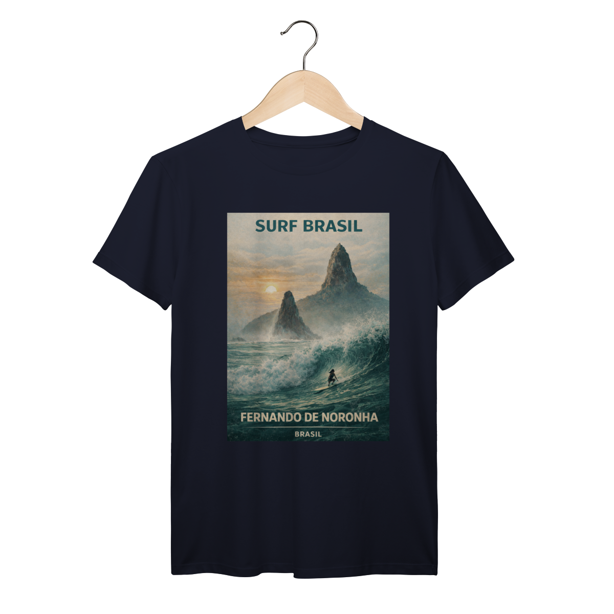 Fernando de Noronha é um dos paraísos naturais mais impressionantes do Brasil. Nesta arte inspirada em pôsteres clássicos de viagem, um surfista enfrenta uma onda perfeita enquanto o pôr do sol ilumina os icônicos morros vulcânicos da ilha. Um tributo ao mar cristalino, às paisagens dramáticas e ao espírito aventureiro do surf brasileiro.