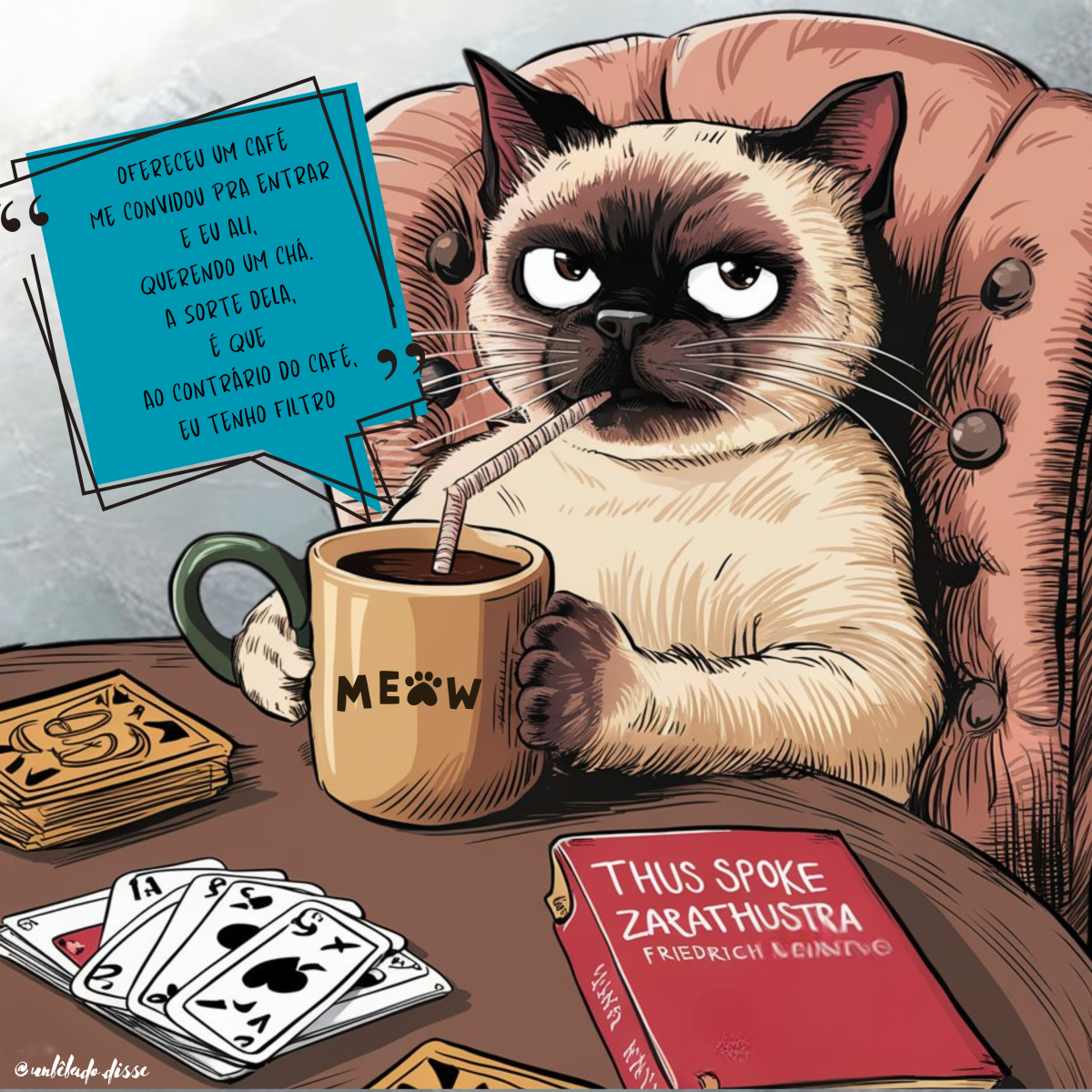 Prepare-se para a união perfeita entre sarcasmo felino, niilismo de Nietzsche e aquele cafezinho amargo da realidade. Esta camiseta da Loja do Bêbado traz um gato ranzinza — com alma de filósofo e cara de quem já leu “Assim Falou Zaratustra” três vezes só pra provar que a vida é um tédio absurdo.